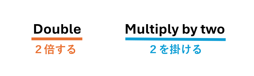 日本語にすると、「Double」は「2倍する」、「Multiply by two」の方は「2を掛ける」のような違いです。
