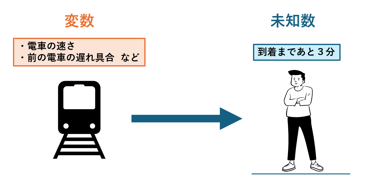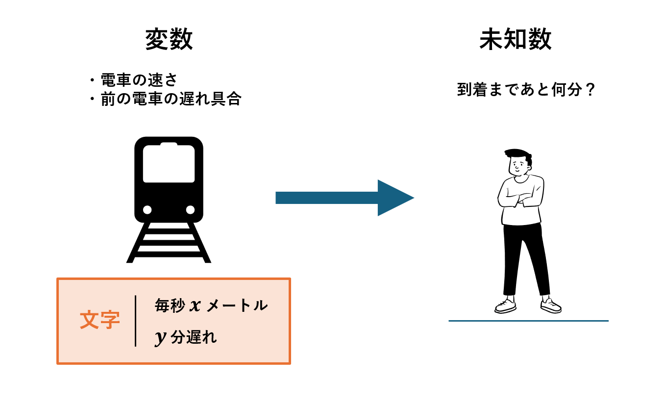 上の例で、電車の速さや前の電車の遅れ具合などの数値すうち・情報は「変数へんすう」と呼ばれます。