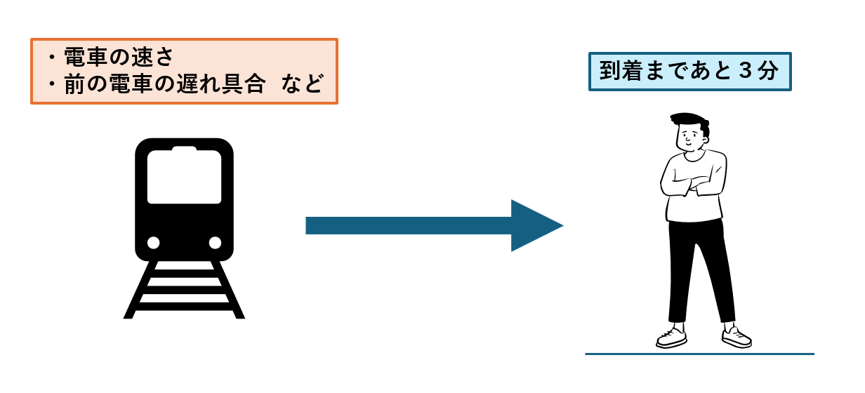 これは電車の速さや前の電車の遅れ具合などの情報をもとに「あと何分で到着するか」を計算して表示されているわけです。
