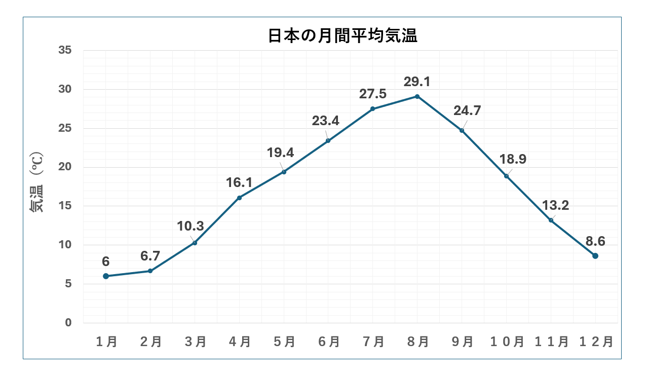 (8月以降から気温は減少しはじめ、12月に8.6℃まで落ちる) - The average temperature in Japan starts low in January at 6°C and slowly rises each month until August.