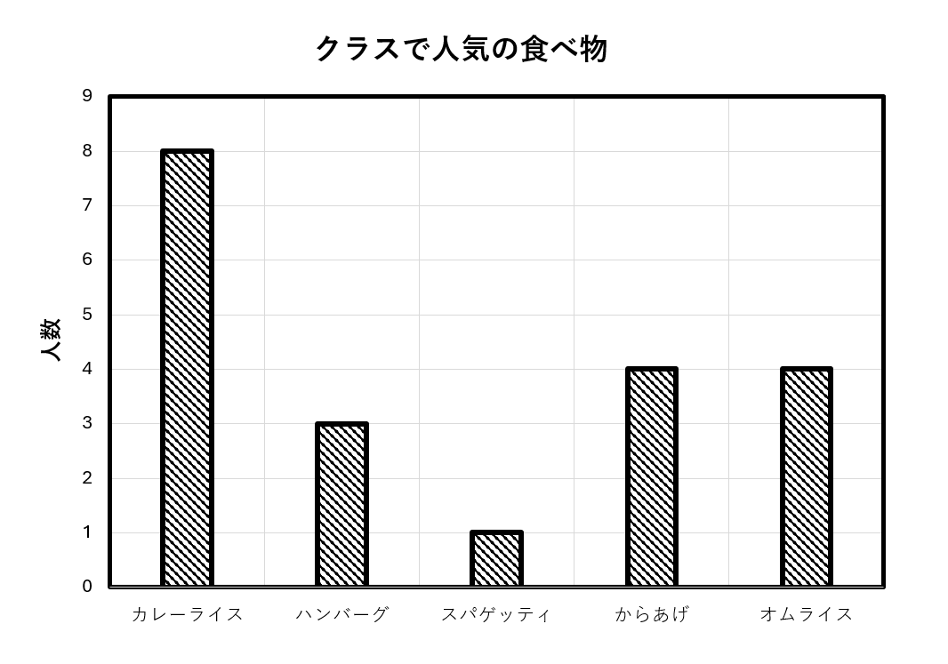 (からあげはカレーライスよりも人気がない) - “カレーライス” was chosen by 8 students, 4 more than those who chose “からあげ”.