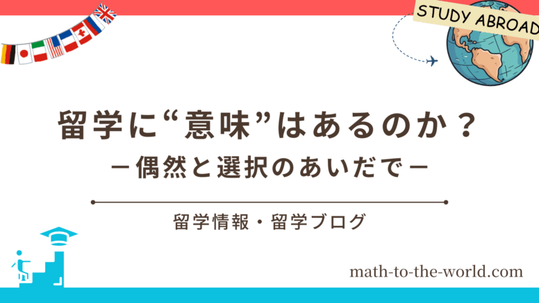 留学情報・留学ブログ 留学に“意味”はあるのか? -偶然と選択のあいだで- 留学は本当に人生の転機になるのか? 留学を考えている方や留学に興味のある方に対して、自身の体験をもとに、留学の意味や価値について現実的に考察します。 2025.11.25 留学情報・留学ブログ